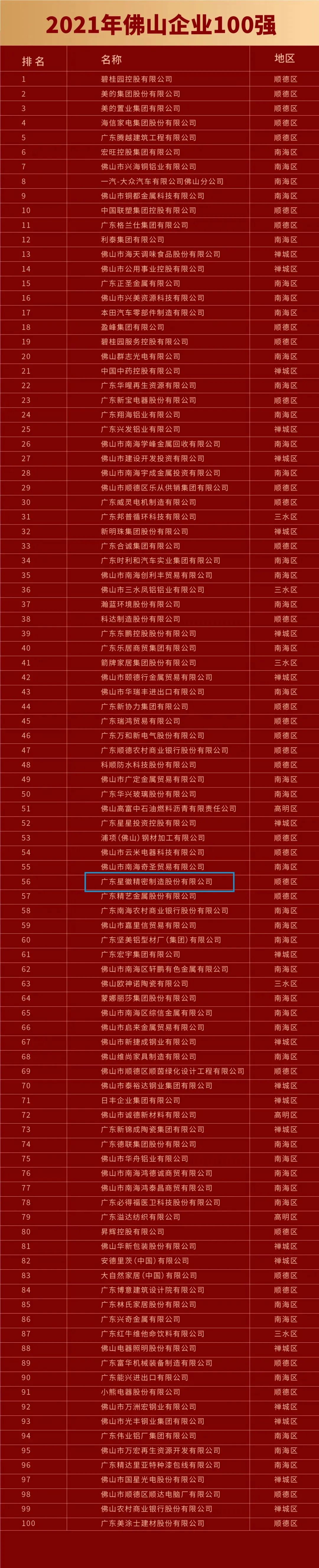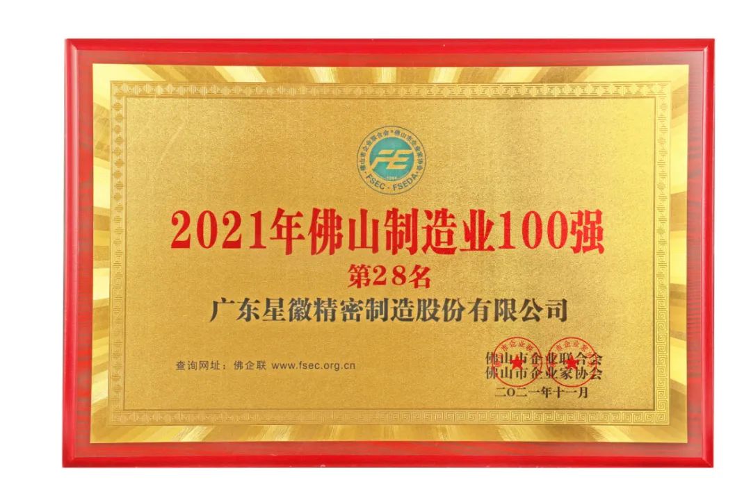 2021年11月20日,由佛山市企業(yè)聯(lián)合會、佛山市企業(yè)家協(xié)會主辦的2021年佛山市企業(yè)家活動日暨佛山企業(yè)100強、制造業(yè)100強企業(yè)發(fā)布會順利舉行。會上發(fā)布了佛山雙百強榜單,憑借強勁的綜合實力和品牌影響力,星徽精密榮登“2021年佛山企業(yè)100強“第56名、“2021年佛山制造業(yè)100強”第28名,在家居五金企業(yè)中排名位列第一。