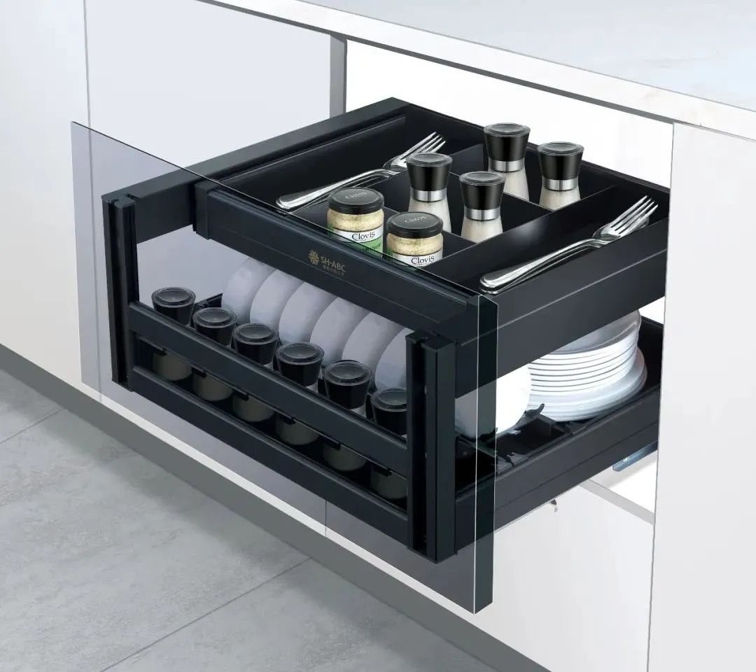 在廚房功能五金區(qū)域,星徽精密展出了全鋁星耀系列產品,簡約的設計加上采用全鋁與鋼化玻璃的組合,精細的做工,盡顯全鋁拉籃的輕奢高級。