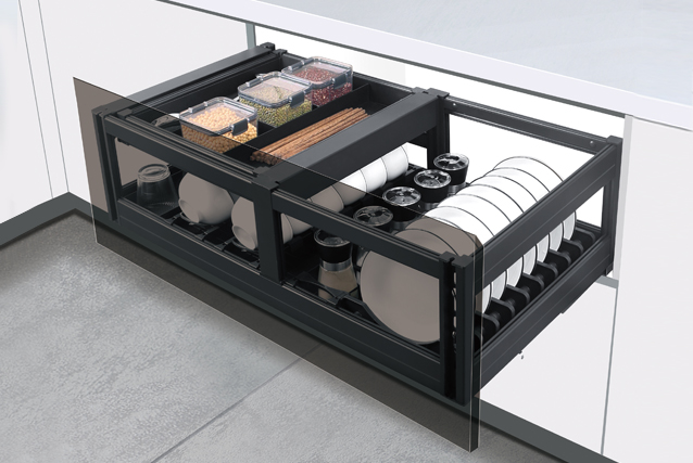→ 設(shè)計(jì):標(biāo)配星徽阻尼滑軌,開(kāi)合順滑流暢、靜音自動(dòng)回位; 抽中抽多層收納結(jié)構(gòu)提升立體空間使用率,同時(shí)可移動(dòng)式碗碟架,方便清潔衛(wèi)生或靈活使用。