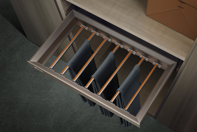 加厚防滑掛桿設(shè)計(jì),桿距自由調(diào)節(jié),拿取便捷,增大收納空間; 讓您的褲子收納井井有序,保持熨燙之后的平整;獨(dú)具匠心的隱藏式緩沖滑軌設(shè)計(jì),賦予您優(yōu)雅靜謐的高貴生活。